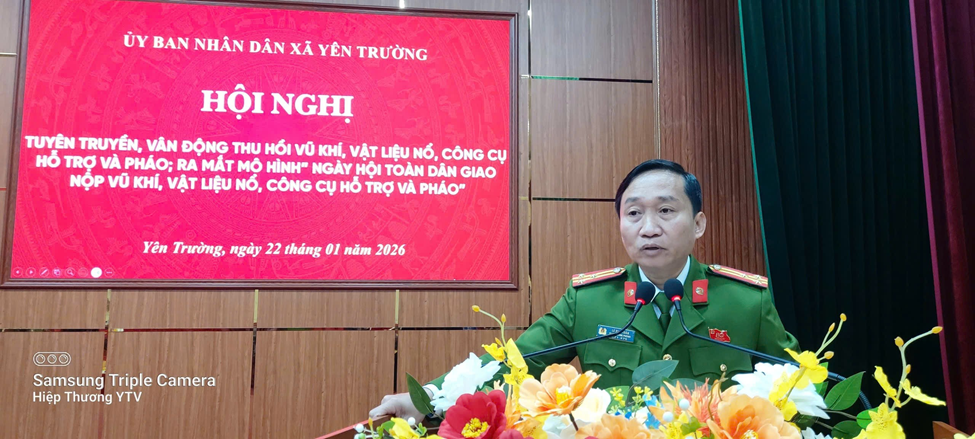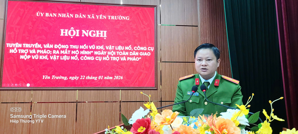 Sáng ngày 22/01/2026, UBND xã Yên Trường tổ chức Hội nghị “Tuyên truyền, vận động thu hồi vũ khí, vật liệu nổ, công cụ hỗ trợ và pháo", ra mắt mô hình “Ngày hội toàn dân giao nộp vũ khí, vật liệu nổ, công cụ hỗ trợ và pháo” trên địa bàn xã năm 2026.