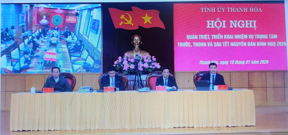 Sáng 10/01/2026, dưới sự chủ trì của các đồng chí: Nguyễn Doãn Anh, Ủy viên Trung ương Đảng - Bí thư Tỉnh ủy; đồng chí: Nguyễn Hoài Anh, Ủy viên dự khuyết Trung ương Đảng - Phó Bí thư Tỉnh ủy, Chủ tịch UBND tỉnh; đồng chí: Nguyễn Hồng Phong, Phó Bí thư Thường trực Tỉnh ủy; đồng chí: Trịnh Tuấn Sinh, Phó Bí thư Tỉnh ủy - Chủ tịch Ủy ban MTTQ tỉnh, Tỉnh ủy Thanh Hóa tổ chức Hội nghị quán triệt, triển khai nhiệm vụ trọng tâm trước, trong và sau Tết Nguyên đán Bính Ngọ 2026. Hội nghị được kết nối từ điểm cầu Tỉnh ủy Thanh Hóa đến 166 xã, phường trong tỉnh.